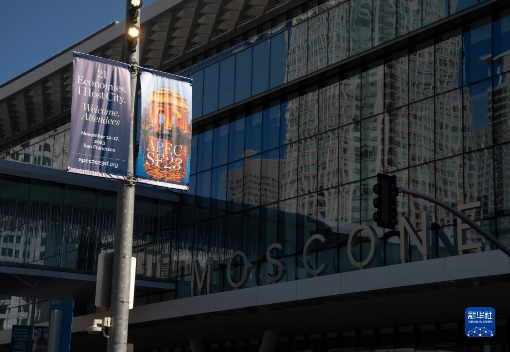 这是11月7日在美国旧金山拍摄的亚太经合组织会议场地外的宣传海报。
