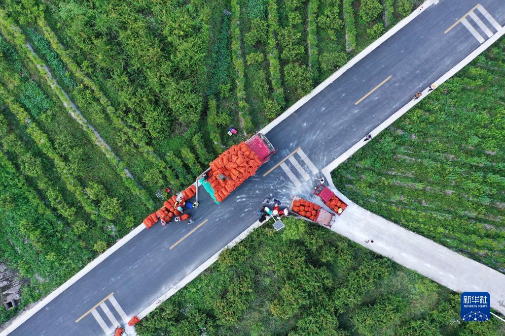 在贵州省龙里县洗马镇台上村,加工企业将收购的刺梨鲜果装车(2021年8月18日摄,无人机照片)。