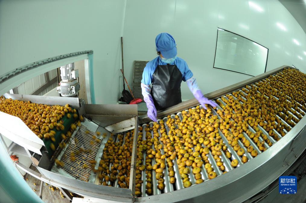 在贵州省龙里县高新技术产业园区一家刺梨加工企业,工人在传送带上筛选刺梨鲜果(2018年8月23日摄)。