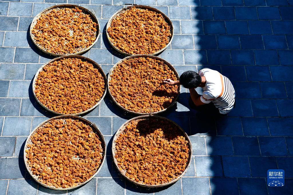 农民在贵州省龙里县谷脚镇茶香村一家刺梨专业合作社晾晒刺梨果脯(9月1日摄)。