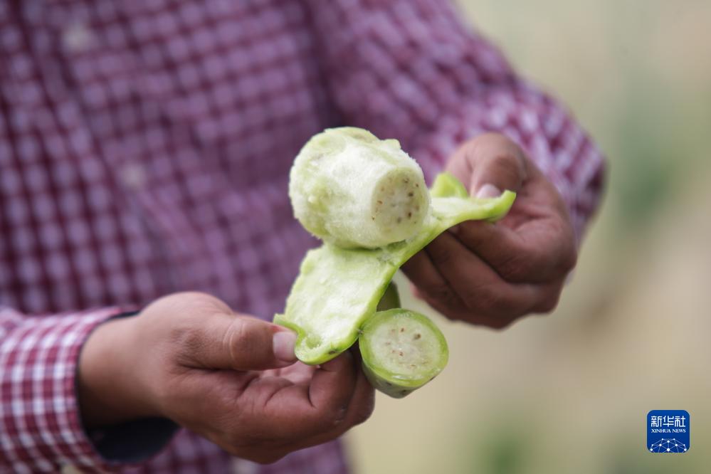 在墨西哥墨西哥州特奥蒂瓦坎,一名农民剥开仙人掌果进行展示(8月3日摄)。