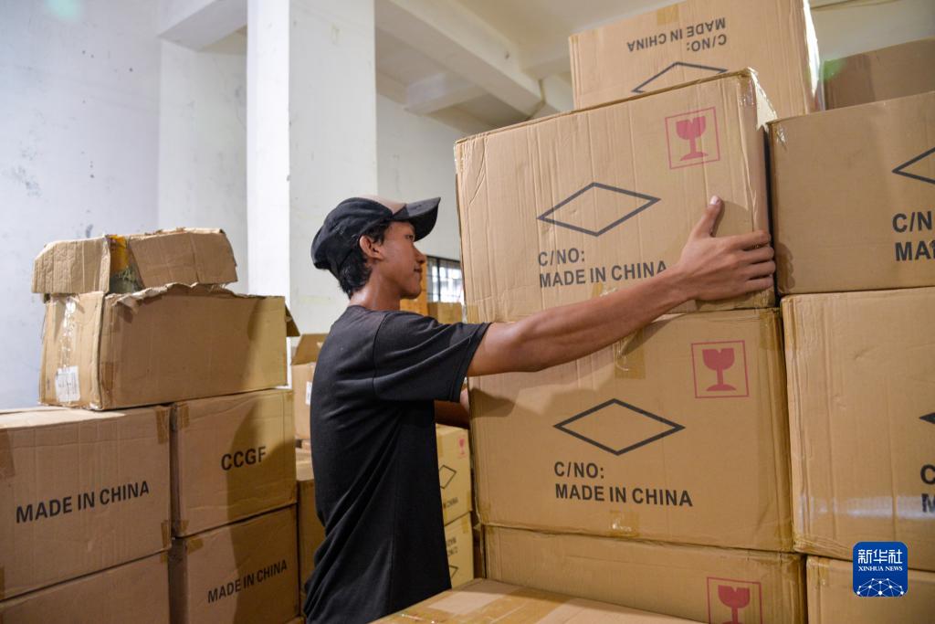 11月10日,在印度尼西亚雅加达,“美丽珍珠商店”员工在“双十一”购物节期间搬运来自中国的货品。