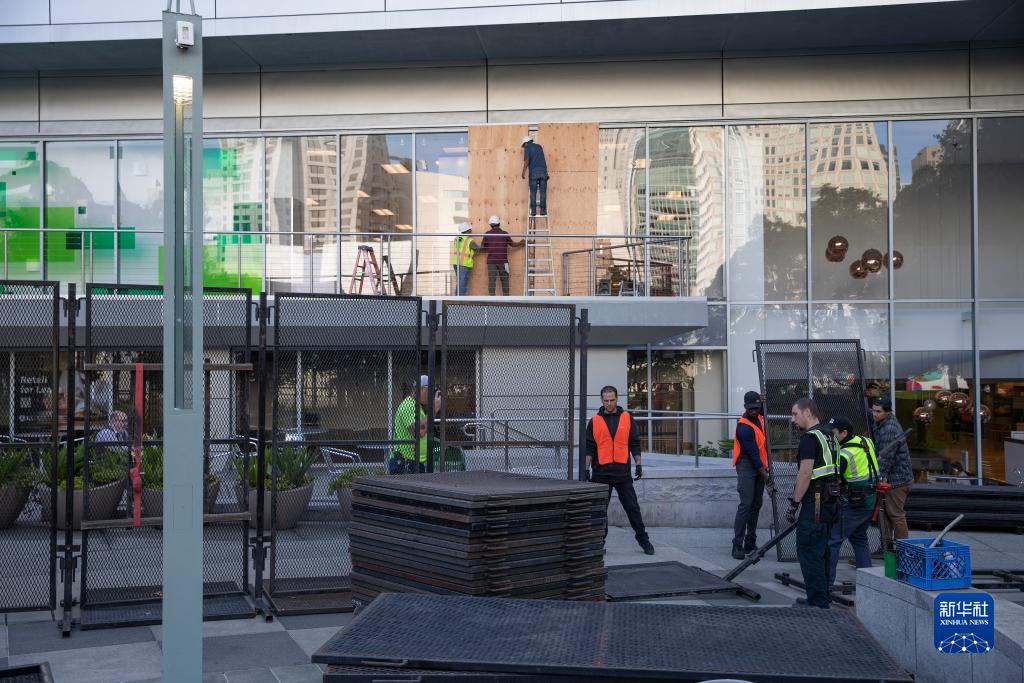 11月10日,工作人员在美国旧金山亚太经合组织会议场地外安装金属围栏。