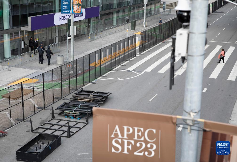 11月10日,在美国旧金山,亚太经合组织会议场地外竖起金属围栏。