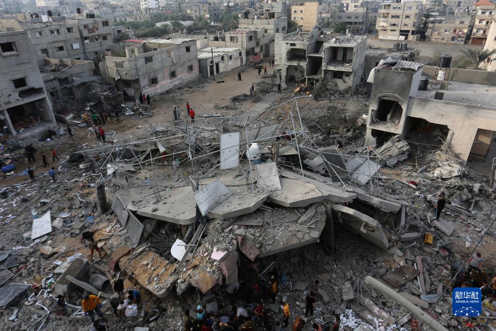 11月11日,在加沙地带南部城市拉法,人们查看遭以色列袭击后的建筑。