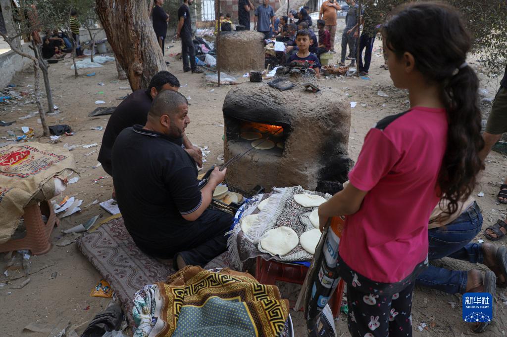 11月11日,在加沙地带南部城市汗尤尼斯,志愿者为无家可归的巴勒斯坦人制作大饼。