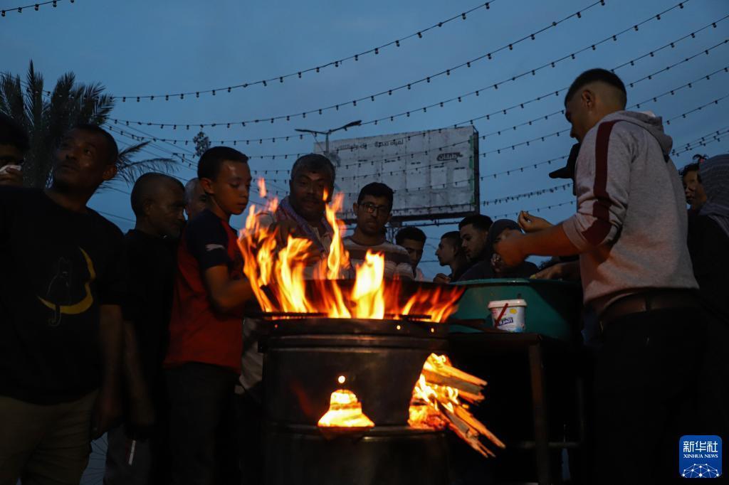 11月11日,人们在加沙地带南部城市汗尤尼斯街头用柴火做饭。