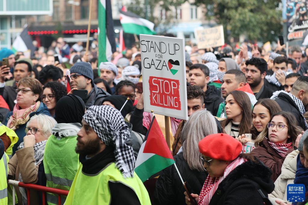 当日,众多巴勒斯坦支持者在比利时布鲁塞尔集会,呼吁尽快实现加沙停火 。
