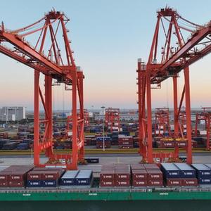11月11日,一艘轮船靠泊在唐山港京唐港区集装箱码头装货(无人机照片)。