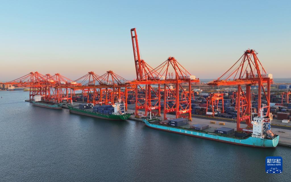 11月11日,三艘轮船靠泊在唐山港京唐港区集装箱码头装卸货(无人机照片)。