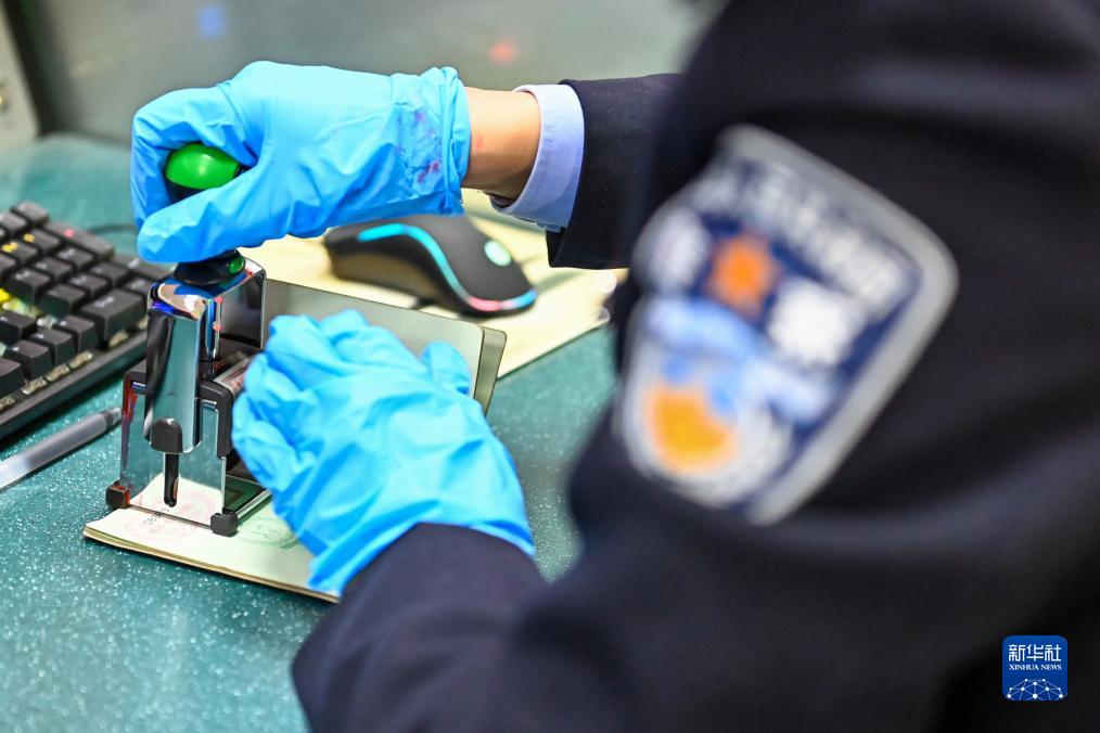 在新疆红其拉甫口岸联检大厅,红其拉甫边检站民警为出境旅客办理边检手续(11月6日摄)。