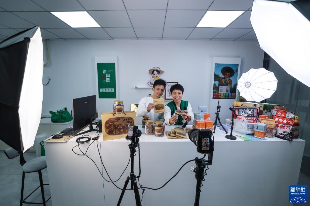 11月12日,浙江省诸暨市东白湖镇上英村党总支书记赵坚均、党员志愿者庄园(右)在“上英园梦”共富工坊直播间销售香榧。
