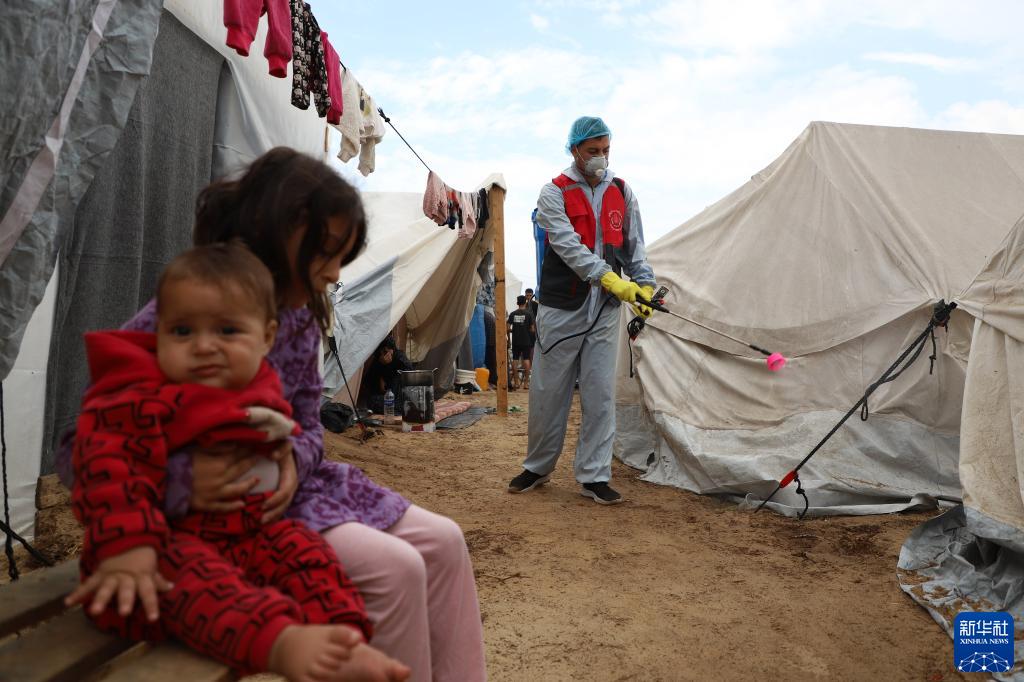 11月12日,工作人员在加沙地带南部城市汗尤尼斯一处临时难民营喷洒消毒液。