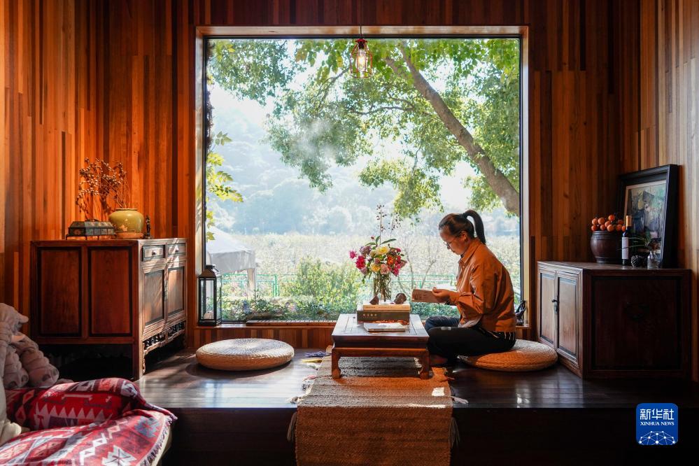 游客在江苏省苏州市通安镇树山村的一家民宿内休闲阅读(11月2日摄)。