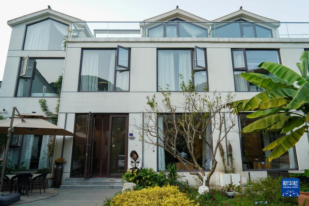 在树山村一处民宿,主理人曹莉莉在打扫民宿庭院(11月2日摄)。