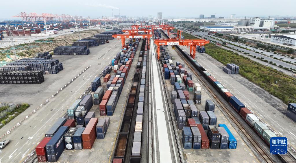 火车在钦州港码头装运集装箱(11月12日摄,无人机照片)。