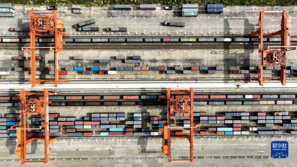 火车在钦州港码头装运集装箱(11月12日摄,无人机照片)。