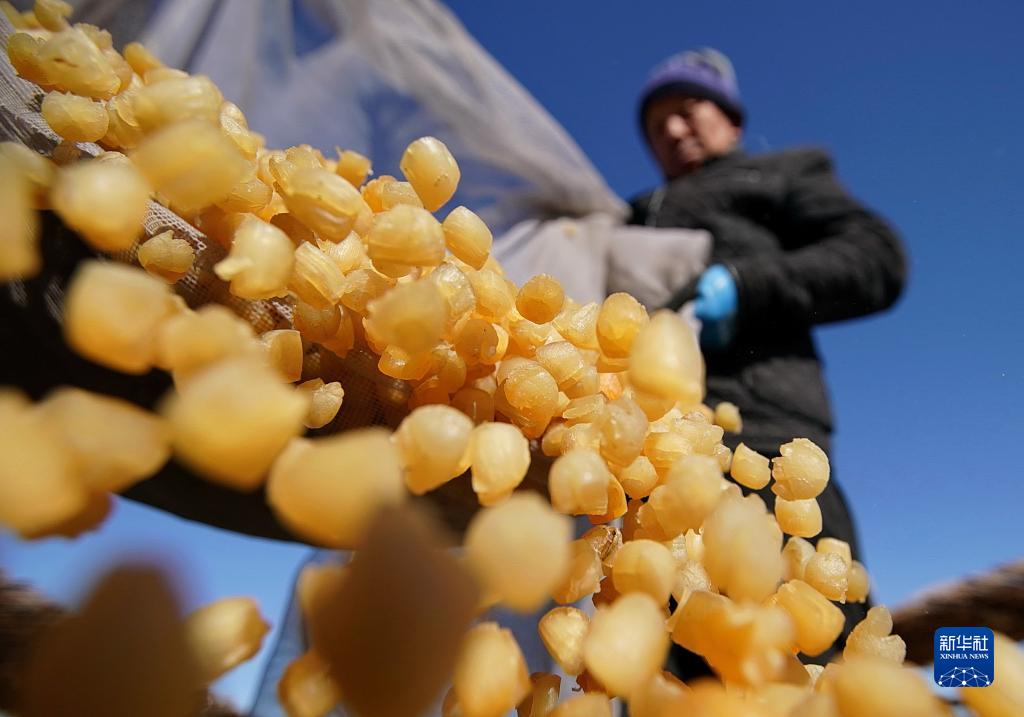 11月13日,秦皇岛市昌黎县团林乡的扇贝养殖户在将晾晒好的扇贝柱装箱。