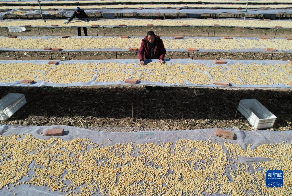 11月13日,秦皇岛市昌黎县团林乡的扇贝养殖户在晾晒收获的扇贝柱(无人机照片)。