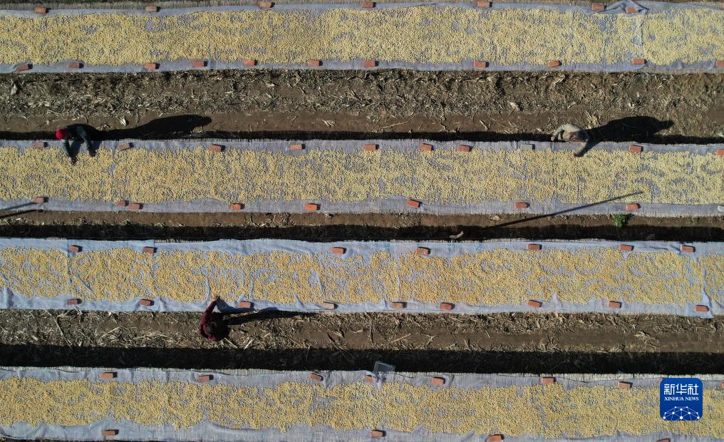 11月13日,秦皇岛市昌黎县团林乡的扇贝养殖户在晾晒收获的扇贝柱(无人机照片)。