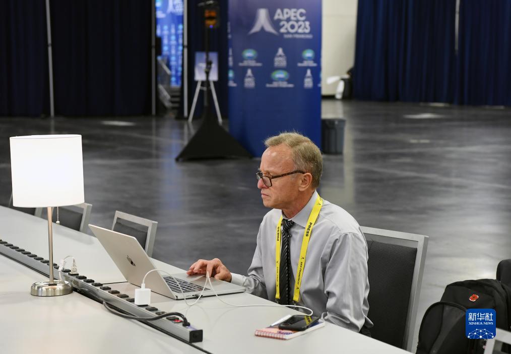 11月12日,一名记者在美国旧金山的2023年亚太经合组织会议国际媒体中心内工作。