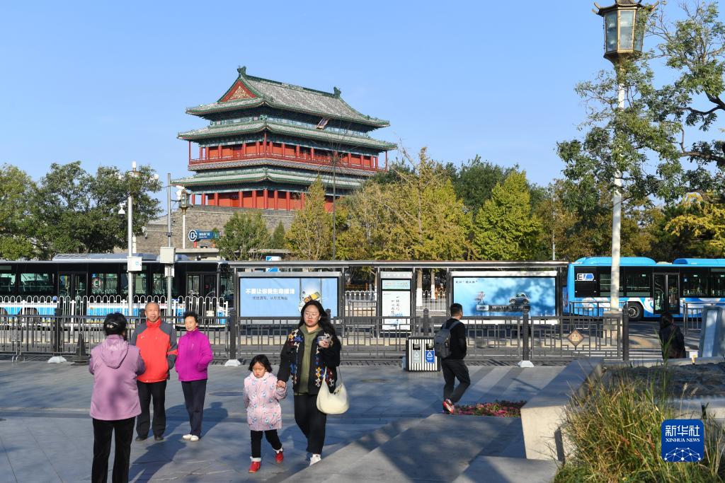 游客在正阳门城楼前参观游览(11月6日摄)。正阳门是中国明、清两代王朝都城的正南门,坐落在老北京城的南北中轴线上,俗称前门。1988年,正阳门城楼和箭楼被国务院批准列入第三批全国重点文物保护单位。
