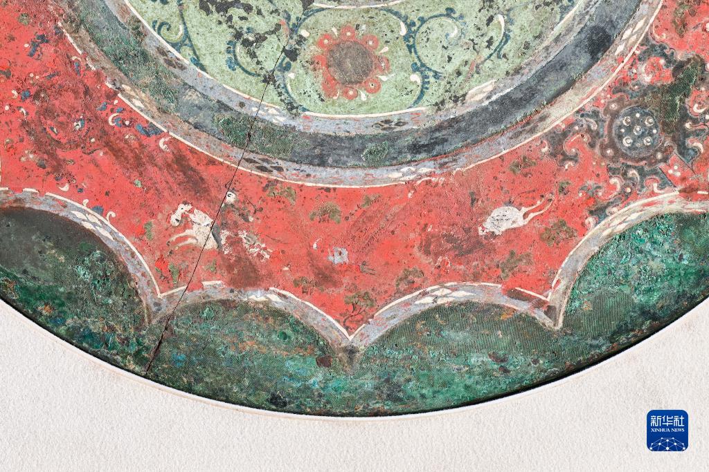 西汉彩绘人物车马镜局部彩绘图案“狩猎”(8月25日摄)。新华社记者 李贺 摄