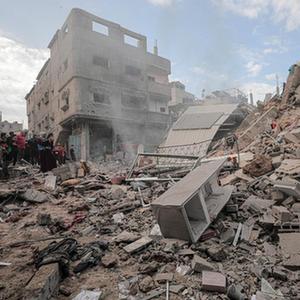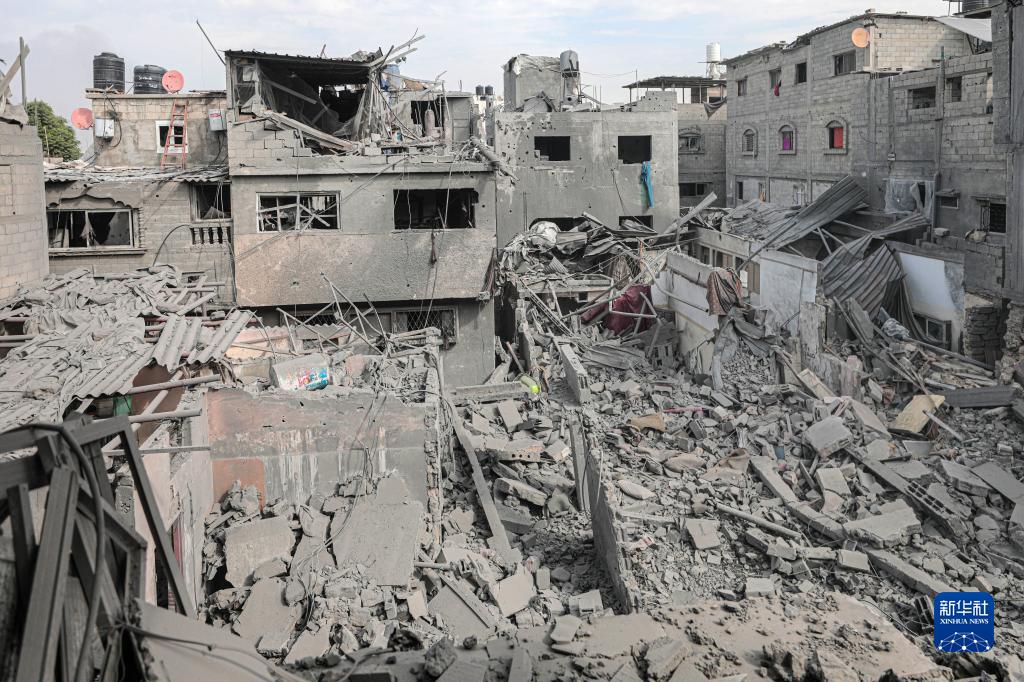 这是11月13日在加沙地带中部地区拍摄的一个遭以色列空袭的建筑废墟。