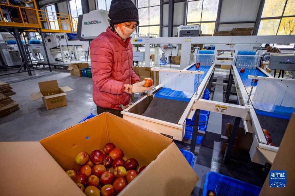 米林市羌纳乡西藏林芝现代苹果标准化园区分拣车间内,工人在流水线上分拣苹果(11月13日摄)。