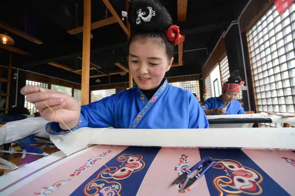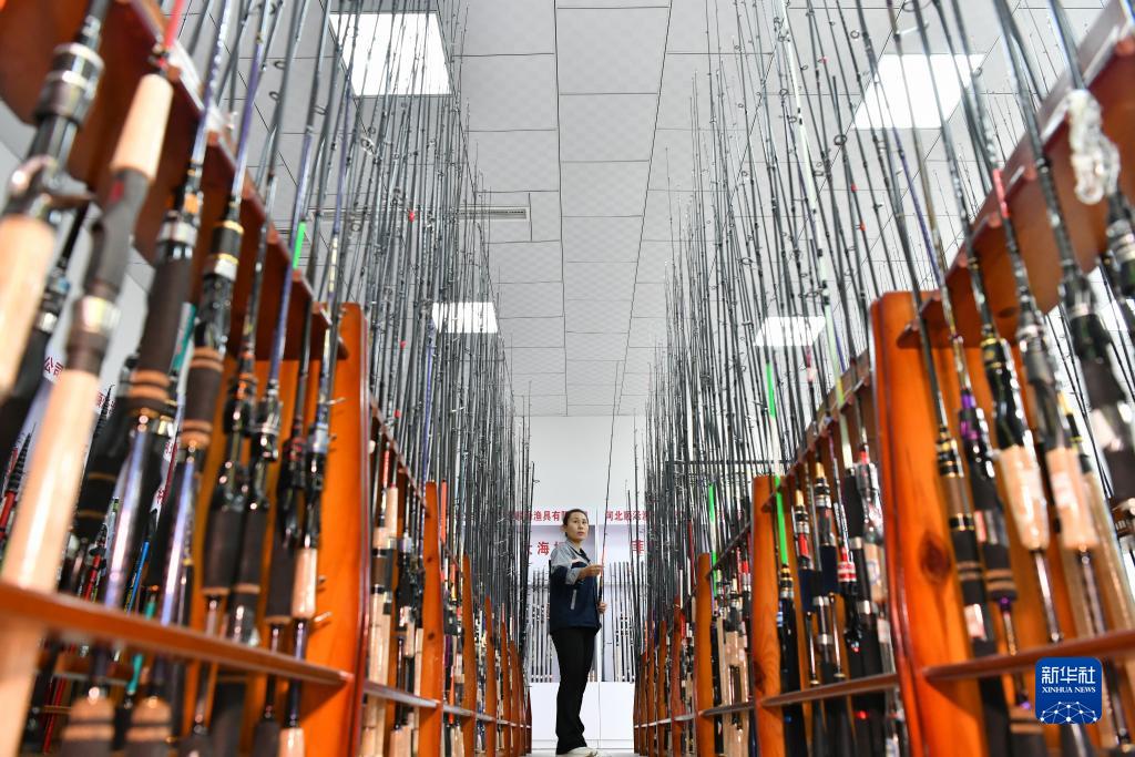 11月14日,河北省肃宁县一家鱼竿渔具生产企业的工人在整理产品。