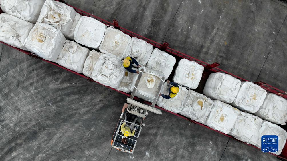 11月14日,工人在施秉县一家饲料生产企业内搬运饲料(无人机照片)。