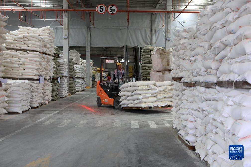 11月14日,工人在施秉县一家饲料生产企业车间内搬运饲料。