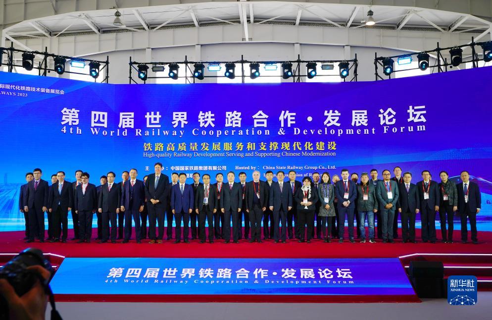 11月14日,参加第四届世界铁路合作·发展论坛的嘉宾在合影留念。