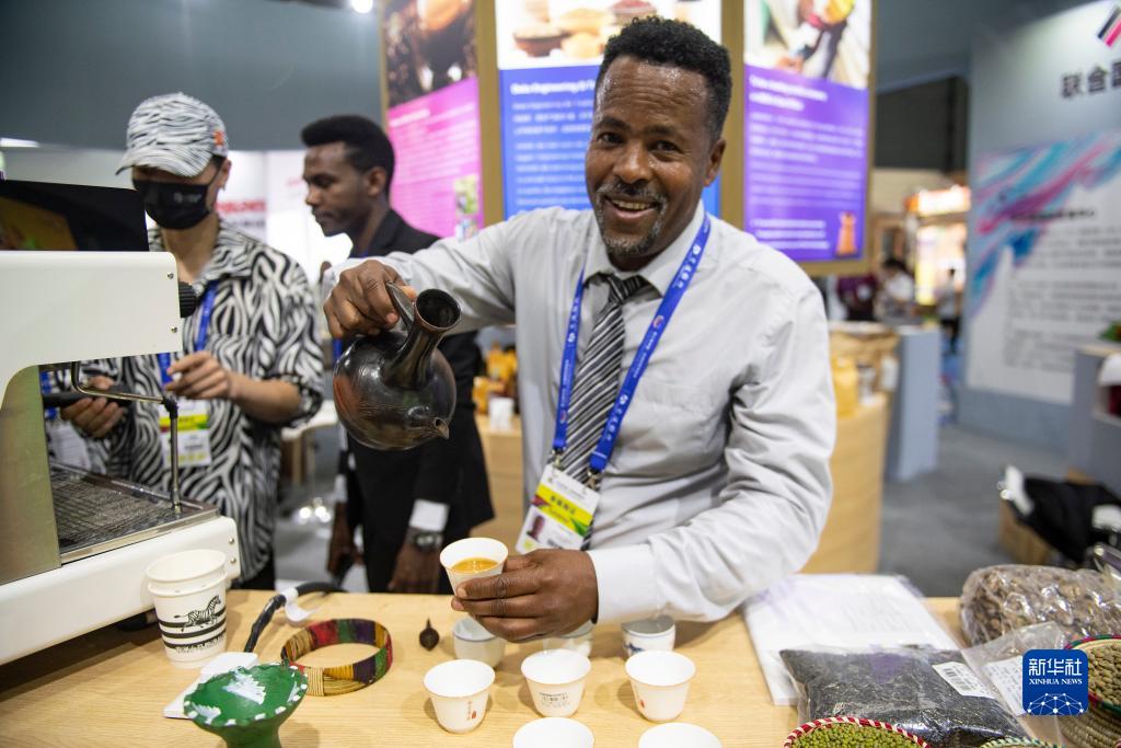 在长沙举行的第三届中国-非洲经贸博览会上,参展商阿尔弗莱德·安托尼介绍埃塞俄比亚咖啡(2023年6月29日摄)。随着中国开放的大门越开越大、中国咖啡消费的快速增长,埃塞俄比亚咖啡在中国越来越受欢迎。