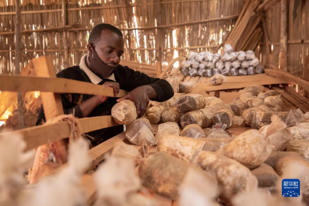 在卢旺达首都基加利的一家食用菌培育作坊,作坊主人埃马纽埃尔·阿希马纳检查菌袋(2020年9月9日)。中国福建农林大学的菌草专家2006年来到卢旺达开始菌草技术合作项目,在当地示范和推广菌草技术。