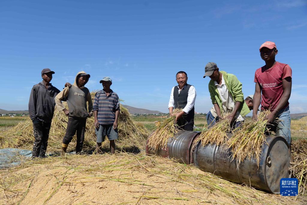 在马达加斯加首都塔那那利佛附近的马义奇镇,中国杂交水稻技术专家胡月舫(右三)在中国国家杂交水稻工程技术研究中心非洲分中心的试验田里和当地农民一起收获水稻(2023年5月12日摄)。自2007年开始,马达加斯加与中国展开杂交水稻技术合作。马达加斯加距离实现粮食自给自足的目标迈近了一大步。