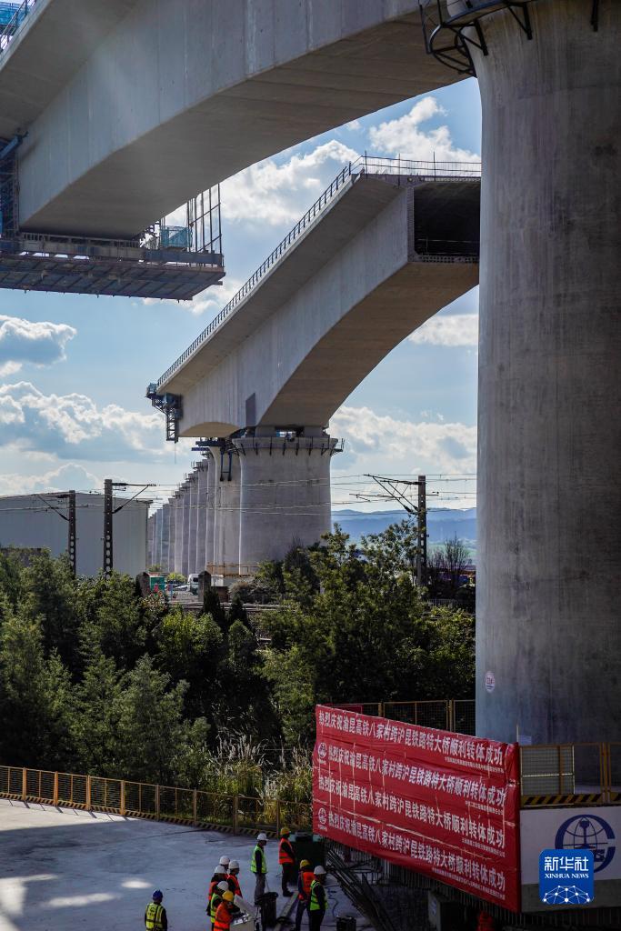 当日,历经1个多小时的空中转体作业,由中铁四局承建的渝昆高铁八家村跨沪昆铁路特大桥、中铁十六局集团承建的渝昆高铁阿里塘特大桥连续梁同步成功转体,在沪昆铁路上方实现精准对接,标志着渝昆高铁桥梁建设取得新突破。