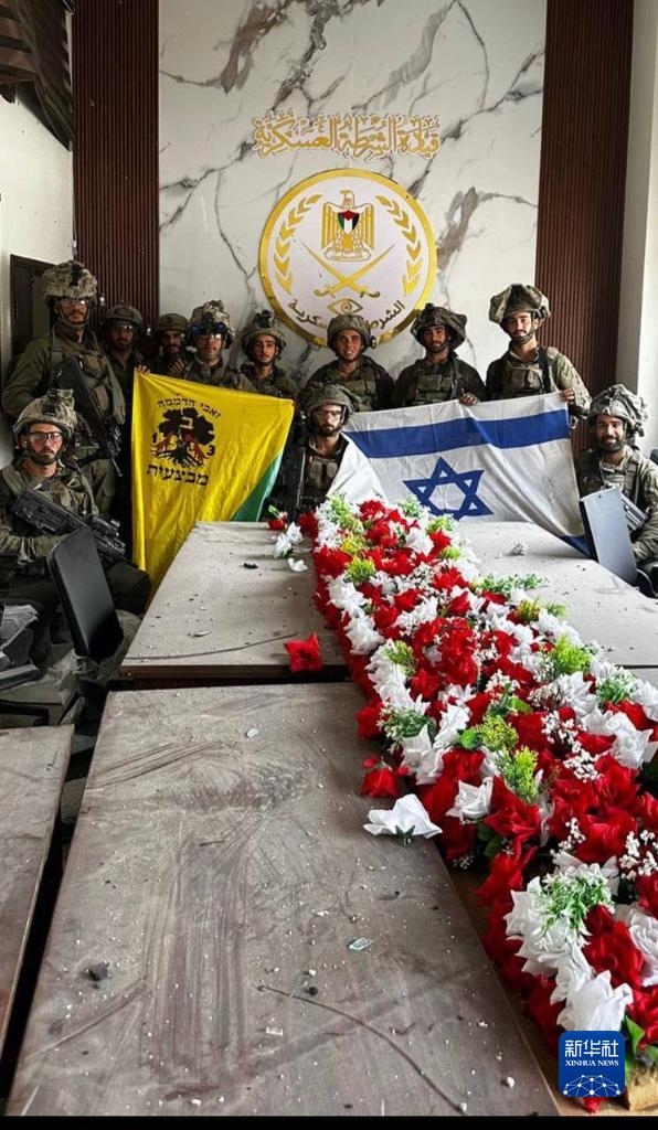 这张以色列媒体11月14日刊发的照片显示,以色列国防军士兵在加沙城巴勒斯坦伊斯兰抵抗运动(哈马斯)宪兵总部举着以色列国旗。