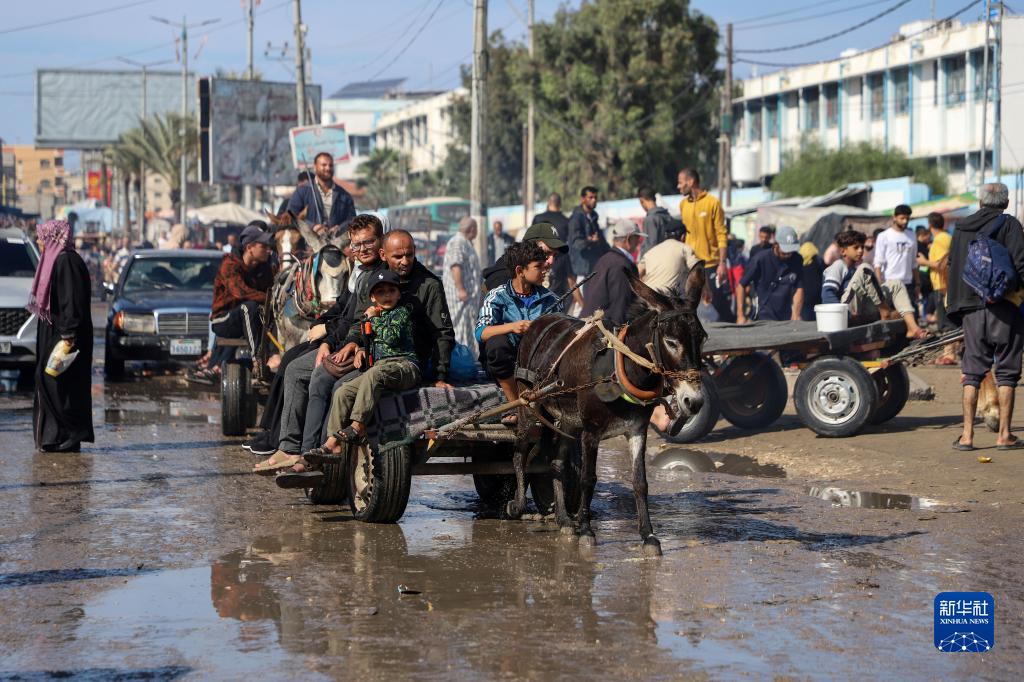 11月14日,在加沙地带南部城市汗尤尼斯,人们乘驴车出行。