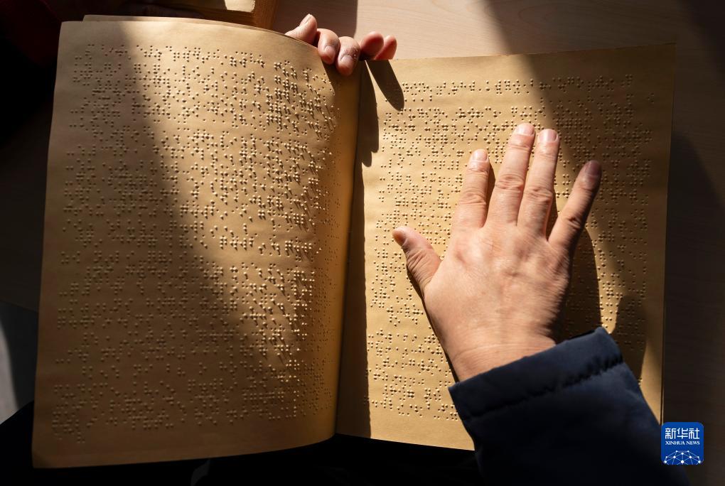 11月14日,在内蒙古乌拉特前旗图书馆视障阅览室内,一名视障人士用指尖“阅读”盲文书籍。