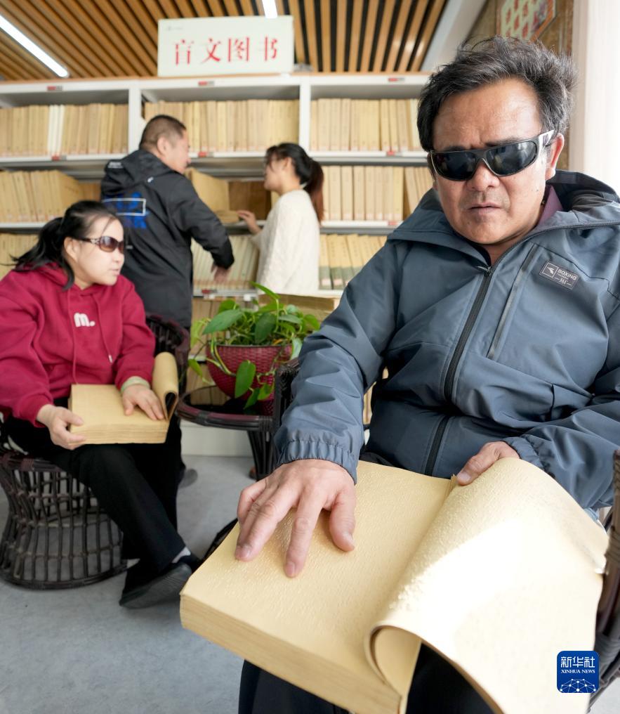 11月14日,在内蒙古乌拉特前旗图书馆视障阅览室内,视障人士在“阅读”盲文书籍。