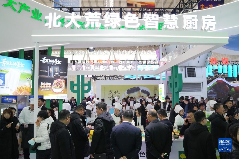 11月15日,在首届中国(黑龙江)国际绿色食品和全国大豆产业博览会的北大荒集团展区,参会者在品鉴食品。
