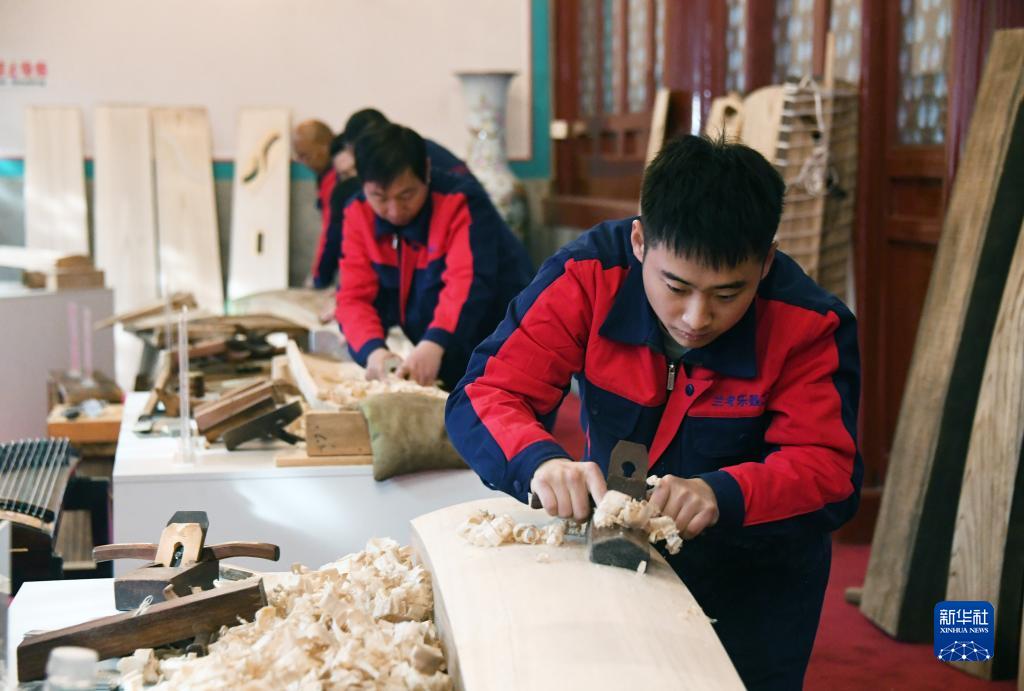 11月15日,乐器制作师在活动中展示“兰考古筝”制作。
