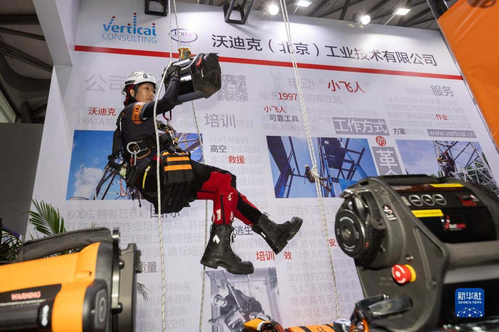 11月15日,在上海国际电力设备及技术展览会的沃迪克展位,工作人员现场演示电动升降机。