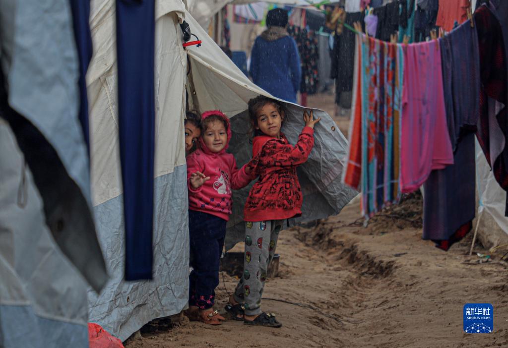这是11月15日在加沙地带南部城市汗尤尼斯一处临时营地拍摄的巴勒斯坦儿童。