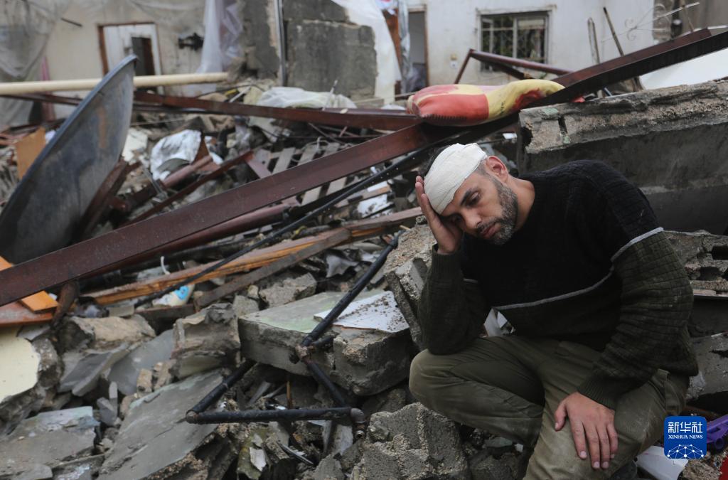 11月15日,在加沙地带南部城市拉法,一名男子坐在遭以色列空袭后的建筑废墟中。