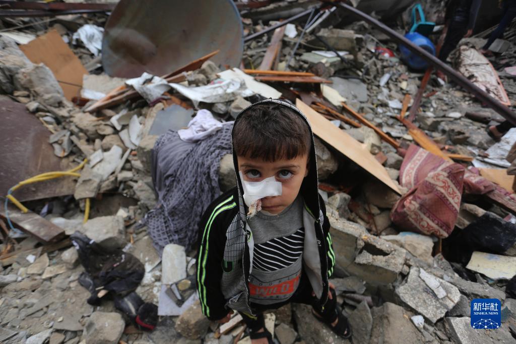 11月15日,在加沙地带南部城市拉法,一名儿童站在遭以色列空袭后的建筑废墟中。