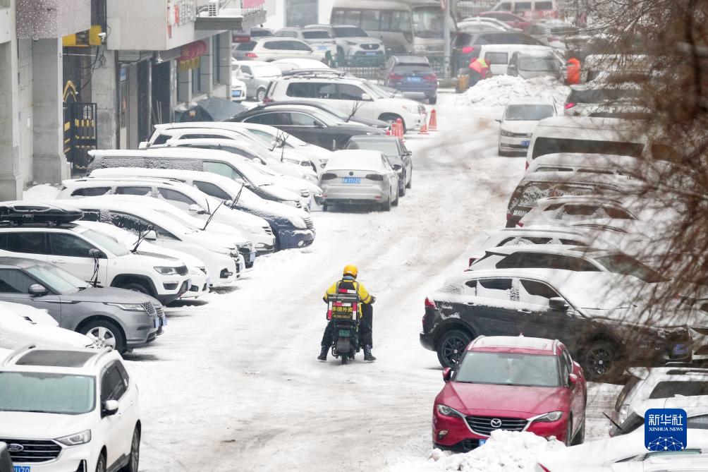 11月16日,送餐员冒雪送餐。