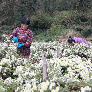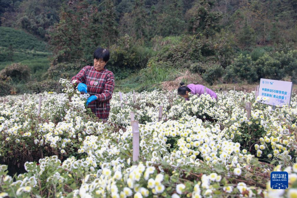 11月16日,村民在歙县深渡镇定潭村黄山贡菊智慧农业示范基地采摘。