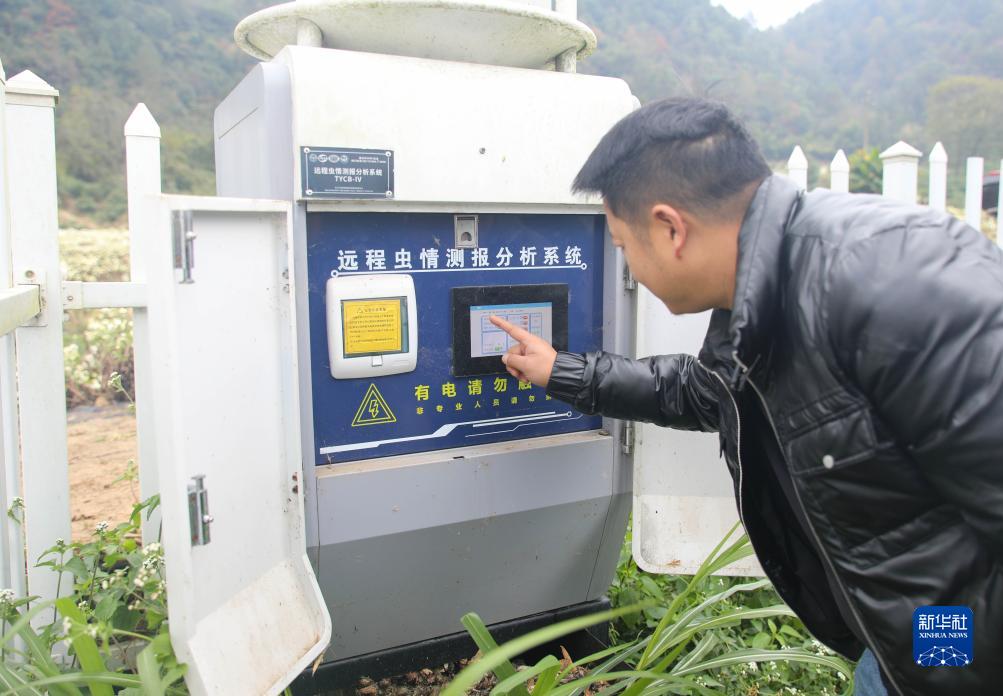 11月16日,歙县深渡镇定潭村黄山贡菊智慧农业示范基地负责人通过虫情测报分析设备查看病虫害情况。
